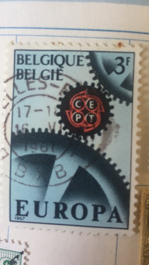 Here’s the cool thing about this stamp: it’s part of a continuing series of Europa Stamps, where each postal administration issues stamps with the same design (to 1974) or the same theme (since 1974), badged Europa, once a year. (See, that is cool.) This design features 22 cogs on a wheel, representing the 22 countries that were part of CEPT in 1967.