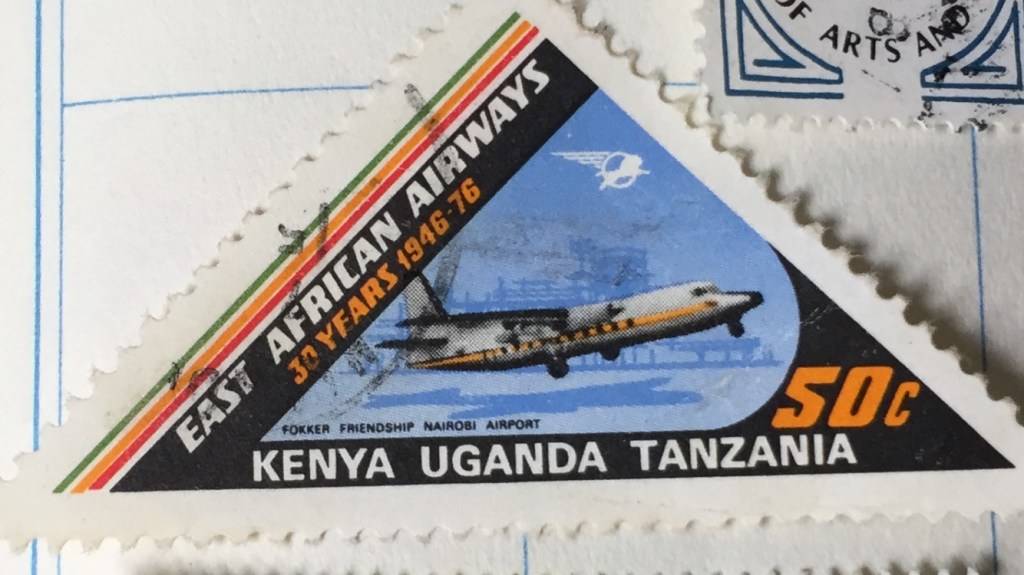 Now here’s a treat! A triangular stamp which, suitably, belongs to three nations. Here’s a celebration of the 30th anniversary of East African Airways.