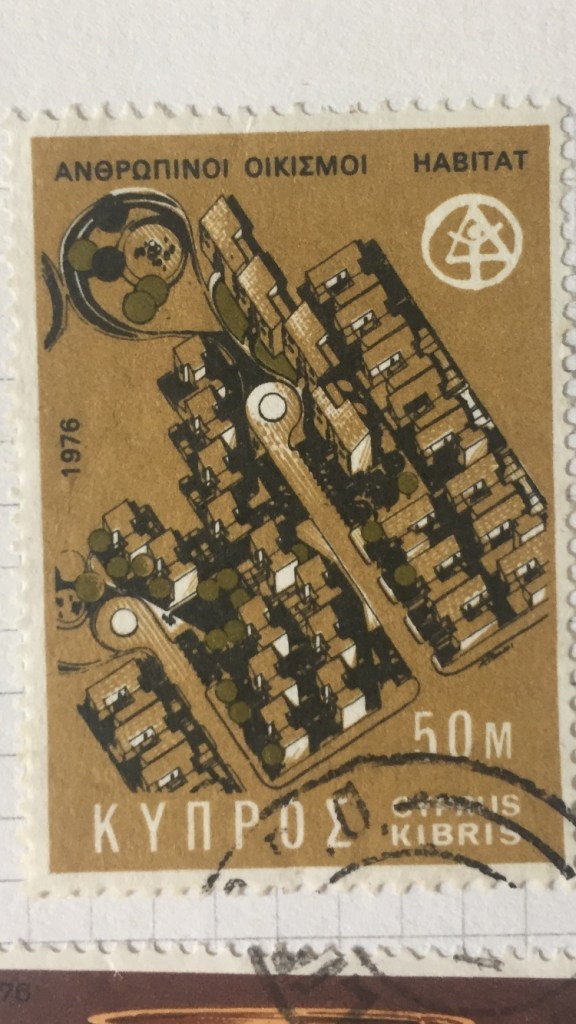 This much I know: this stamp is from Cyprus, dated 1976. The Greek text along the top translates as Human Settlements and we are given the word Habitat too. The image on the stamp suggests a modern development – dense blocks, roads, even little roundabouts for turning vehicles. Beyond that, I’m stumped. I’m sure the logo top-right will mean something but I don’t know what it is…