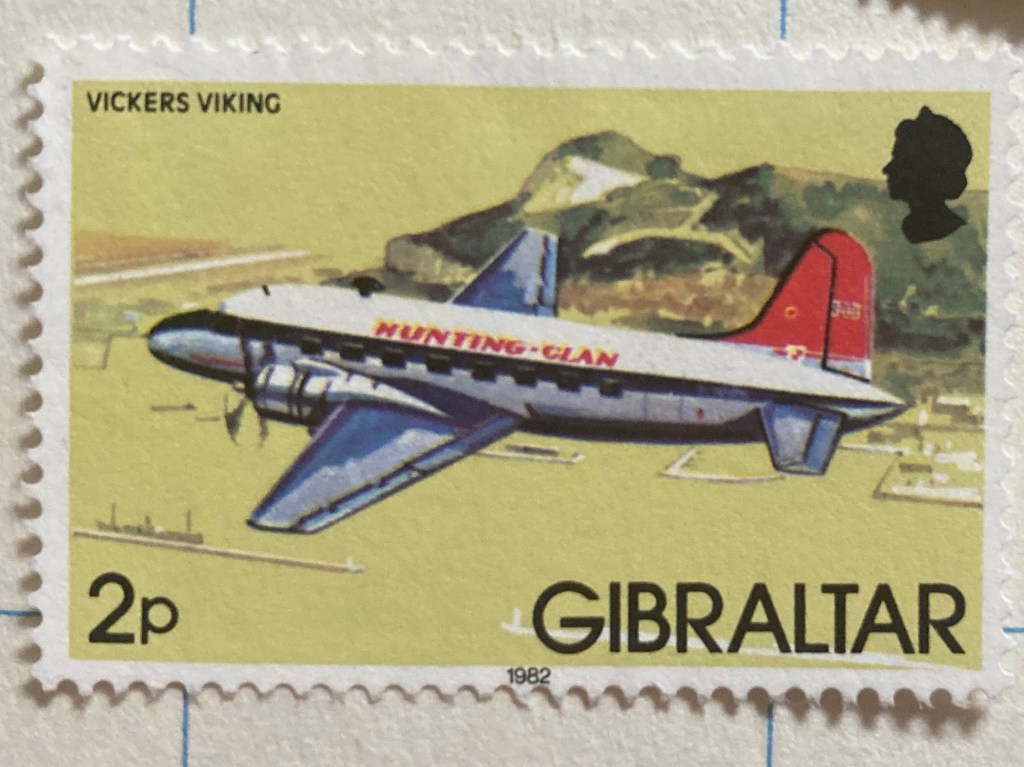 Hunting-Clan Air Transport was an independent airline set up after World War II. Operating mainly from Luton Airport, and latterly from Manchester, it had routes from the UK to many African nations and, as the stamp suggests, to Gibraltar. It had a fleet of 15 planes, of which 12 were Vickers Vikings.