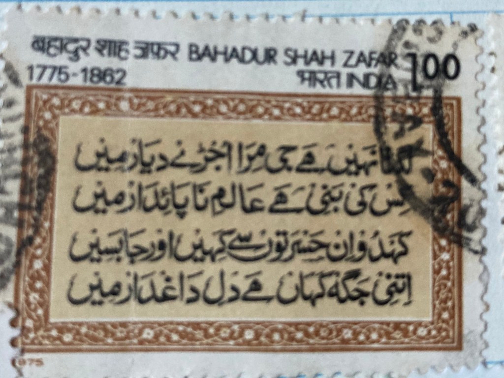 This stamp commemorates the 200th anniversary of the birth of Bahadur Shah Zafar, the last of the Mughal Emperors. The Mughals began to rule parts of the Indian SubContinent in the 1520s and became most powerful around 1700. Their power began to decline and ultimately a combination of the British East India Company, the British more generally and local deputies (for want of a better word) took control of the Indian subcontinent in 1857.