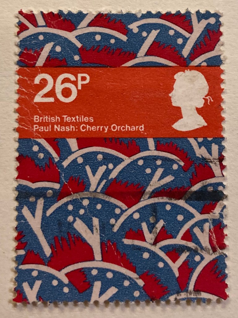 One of seven stamps celebrating British textiles, this one depicts a cherry orchard and was designed by Paul Nash. Nash was a painter who is best known for his landscapes, which often featured surreal landscapes drawn from images of war. He was an official war artist in the First World War but, like many of the poets of that time, there was no glorification of what he witnessed.