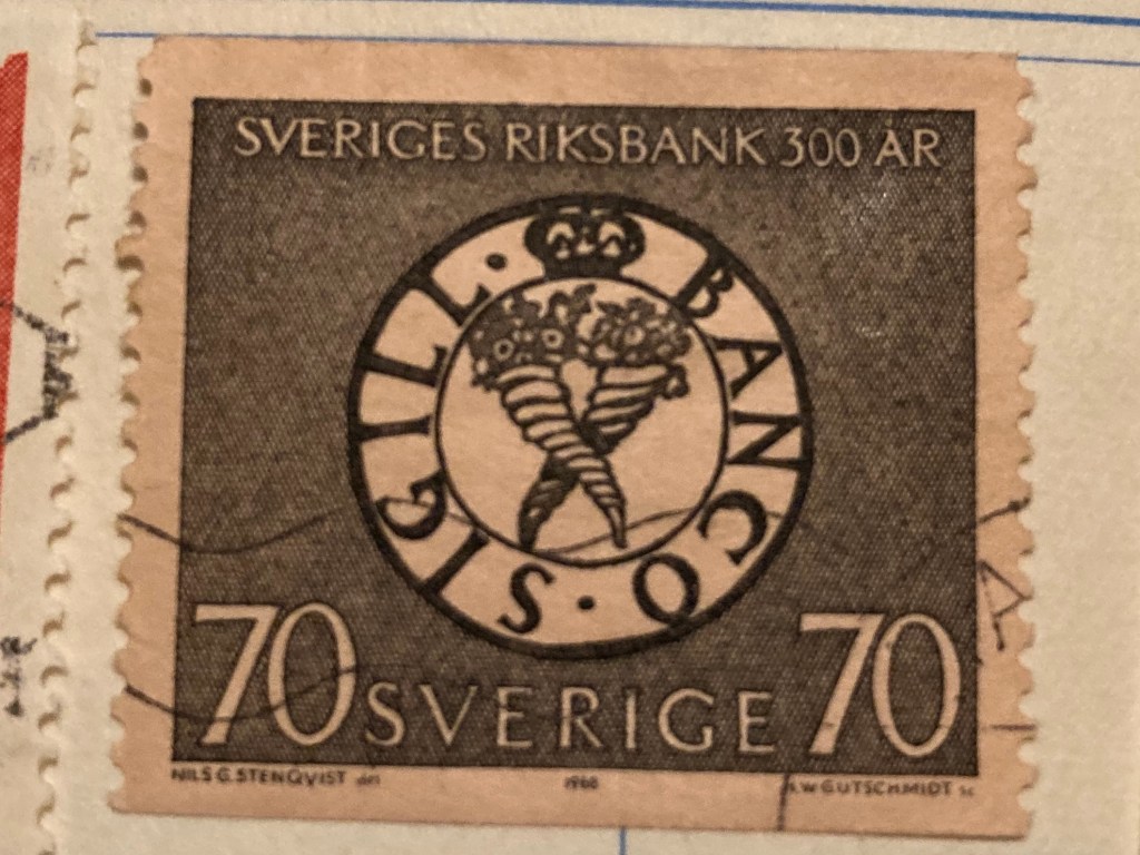 The Swedish Riksbank (or central bank) is the third oldest bank in the world and the longest established national bank. Established in 1668, it celebrated its 350th anniversary a couple of years ago, which was commemorated with a stamp.