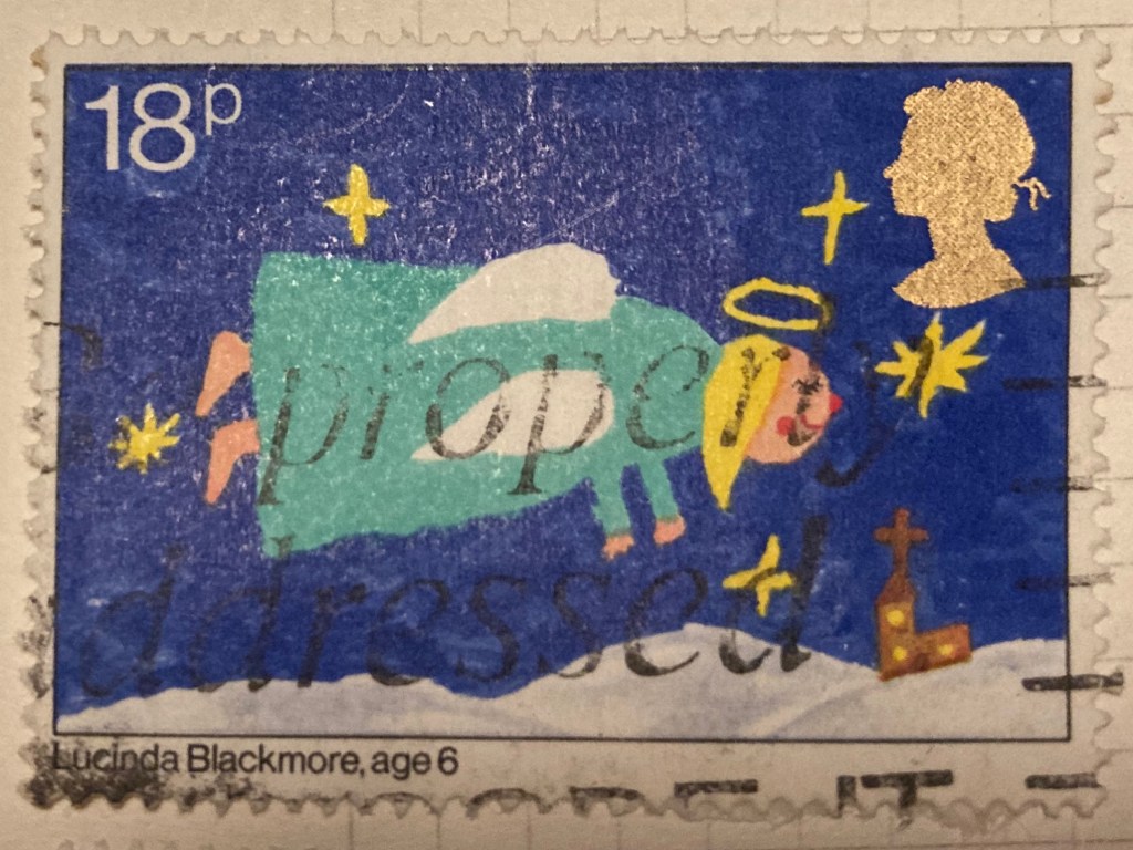 However, on further reflection, it feels like this is the Angel who appeared to the shepherds to announce Jesus’ birth. Clues here will be the telltale star (busy leading Kings) and the snowy ground, suggesting a Winter scene, rather than a summer pregnancy announcement. I’m forgiving of the snowy ground – they could be tending mountain sheep – but I’m a bit skeptical about the appearance of a church… However, when I was 6, I was mainly interested in sucking my thumb and throwing things, so I shall admire Lucinda for her creativity, congratulate her on her stamp, and wonder where she is now, some 39 years later…